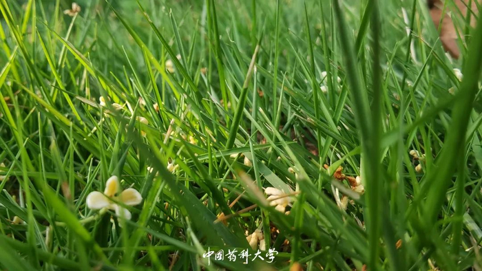 “花团夜雪明,叶翦春云绿。“白居易在《有木》一诗中十字写尽桂花的疏朗明丽,药大的桂花也如诗句中所描述的那样,金黄的花朵在枝头轻轻摇曳,暗暗地把香气铺了满地。桂花树影间,“连中三元”也染上了秋天的颜色,暖暖的甜香满溢出来,药苑的秋就这样美成了诗。