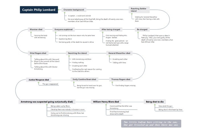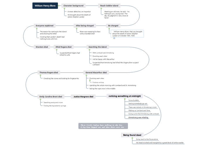 思维导图可以根据一本书的目录来做。比如我上面整理的《无人生还》,每个人物的时间线用思维导图的形式整理出来,一本书看完之后书的核心内容和值得记录的地方十分明晰,后续再回顾这本书的时候也能一秒get到精华点!普通笔记只能片面的复习,但是思维导图能在复习完之后再帮助自己重新回忆一遍,整理知识架构且方便知识之间的联系和知识的发散。而且思维导图可以帮助自己很快找到知识点在哪一块,是开卷神器。
