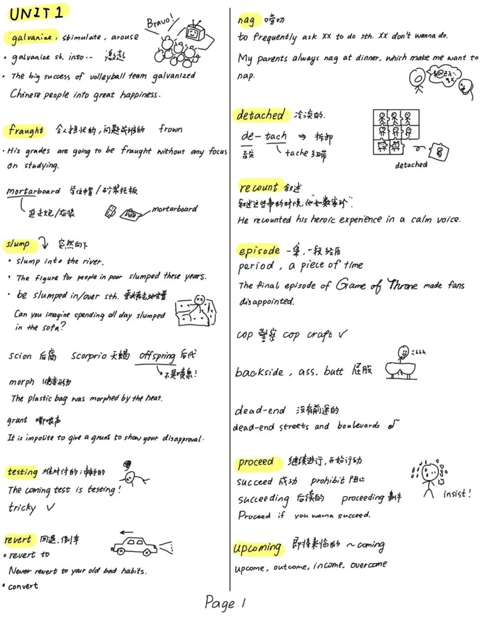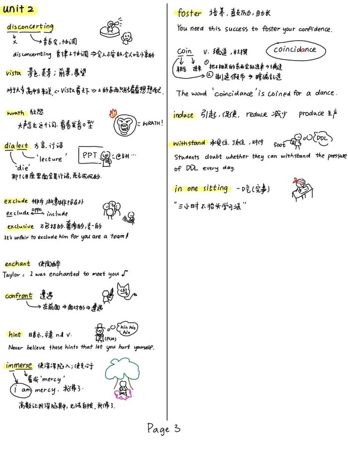 英语记单词会在旁边画小人是因为我记单词需要联想,但是学校的单词书没有这样的词根or联想的记忆在里面,所以自配便于记忆的小插画。