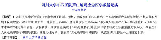 官网提到,华西医院创下世界重大灾难医疗救援史上的许多奇迹,被党和国家领导人赞誉为“不仅有崇高的道德,而且有精湛的技术”,被中共中央、国务院、中央军委授予“抗震救灾英雄群体”的光荣称号。