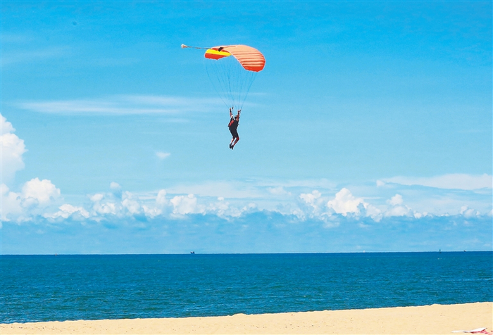 10月4日,游客在东方市鱼鳞洲风景区体验4000米高空跳伞项目。 海南日报记者 李英挺 摄