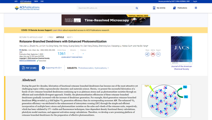 相关研究成果以“Rotaxane-Branched Dendrimers with Enhanced Photosensitization”为题发表在国际化学领域顶级期刊《美国化学会志》上(J. Am. Chem. Soc., 2020, 10.1021/jacs.0c07292)。