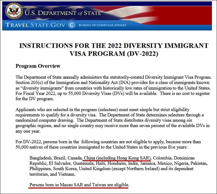 香港国安法让美国坐立难安,叫嚣终止香港特殊待遇地位。据《星岛日报》10月9日报道,新一年度的美国“多元化移民签证计划”(Diversity Visa Program,又称抽签移民签证计划)中,香港居民将不再符合“抽绿卡”资格。