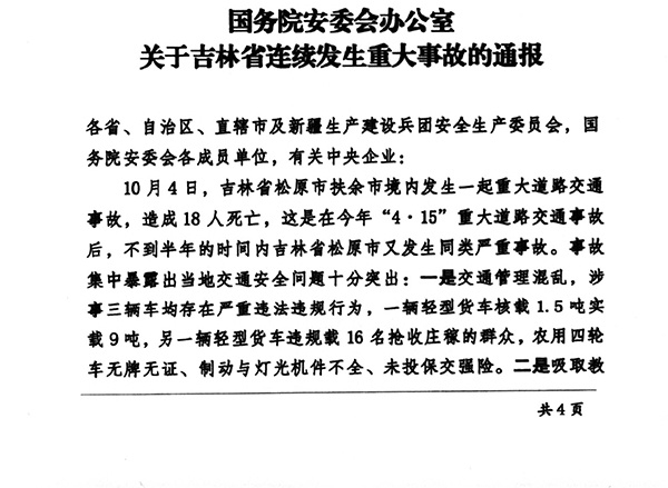 附:国务院安委会办公室关于吉林省连续发生重大事故的通报