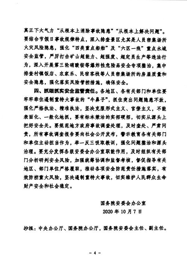 五、坚决严格落实安全监管责任。要严格落实“管行业必须管安全、管业务必须管安全、管生产经营必须管安全”原则,进一步理清责任链条,拧紧责任螺丝,让责任规定真正成为硬约束、硬杠杠,确保工作环环相扣、责任层层压实。要建立问题隐患和措施“清单制+责任制”,对隐患整改开展经常性“回头看”。要进一步规范事故调查处理,及时查处、严肃问责,公开发布调查报告,接受监督,警示教育相关地区和部门。要严禁作风漂浮,杜绝盲目乐观、麻痹大意,克服官僚主义和形式主义。各级安委会办公室要充分发挥牵头抓总、统筹协调作用,加强对各负有安全监管职责部门的指导、监督和检查,采取通报、约谈、问责等措施,督促各有关部门严格履职,推动各项防范责任措施落实。