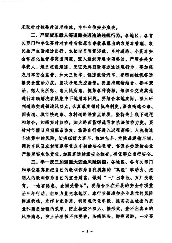 三、坚决开展道路交通安全大整治行动。按照《吉林省人民政府办公厅关于印发全省道路交通安全专项整治行动方案的通知》要求,全面落实道路交通安全整治措施。强化车辆源头整治。规范农用车管理,清查农村上路车辆情况,逐车跟踪建档,落实农用车辆全部粘贴反光贴。全面排查农机证照,摸排非法改装车、无籍客车,加大“四无”车辆清理整顿力度,查处拖拉机、农用机无牌行驶、不按时年检、套牌、伪造车牌等违法行为。盯牢“两客一危一校一货”等重点车辆,坚决杜绝客货两用、客货混载。加大对“百吨王”等超限超载货车根治力度。整治车辆挂靠经营、长期异地运营、运输企业监管主体责任缺失等问题。强化交通违法整治。把高速、国道、省道与乡村道路作为重点,针对农忙、施工人员集中运送、农村赶集、婚丧嫁娶等情况,紧盯事故高发重点时段,坚持市县乡村四级联动,落实“两站”“两员”“一村一警”机制,深化警路联合、警保合作、警企合作,增派警力深入关键区域、路段、卡点,确保有人管、管得住。对疲劳驾驶、逆向行驶、违法载人和超载等严重违法行为要铁拳执法,对“三超一疲劳”、酒驾醉驾毒驾、无证驾驶、闯灯、逆行、强行超车等违法行为决不手软,打出震慑效果。要对驾驶员宣传、培训、管控到位。强化道路风险整治。以隧道、临水临崖、急弯陡坡、农村公路和城乡接合部道路为重点,强化隐患路段排查整治,明确整改措施、部门、责任、资金、时限,确保按期解决。强化人防技防物防,完善视频抓拍、速测设备以及防护栏、分流设施。改善农村道路通行条件,解决交通安全设施缺失、交通引导提示标志不完善等问题。