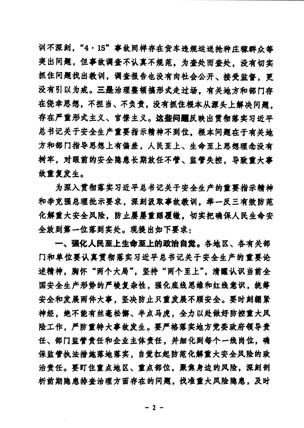 为深入贯彻习近平总书记关于安全生产的重要论述重要指示精神,认真落实国务院安委会工作部署,按照省委、省政府要求,深刻汲取事故教训,深挖根源,源头治理,坚决扭转被动局面,坚决遏制重特大事故发生,坚决维护人民群众生命财产安全。现提出如下要求: