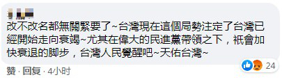 也有网友分析,“改不改名都无关紧要了~台湾现在这个局势注定了台湾已经开始走向衰竭~尤其在‘伟大’的民进党带领之下,只会加快衰退的脚步,台湾人民觉醒吧~天佑台湾~”。