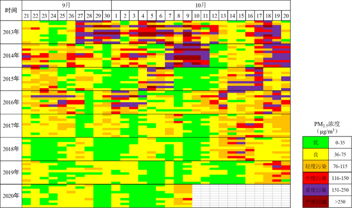△2013—2020年9月下旬—10月中旬北京市PM2.5日均浓度变化(数据来源:中国环境监测总站)