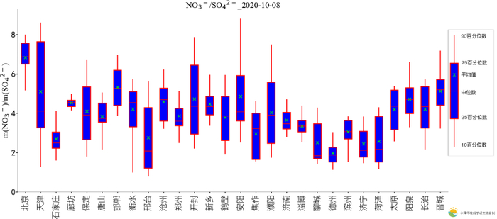 区域北部各城市污染特征也不尽相同,例如石家庄市PM2.5中硝酸根离子与硫酸根离子浓度比约为2~3,明显低于其他城市,当地燃煤排放对PM2.5污染贡献相对突出。