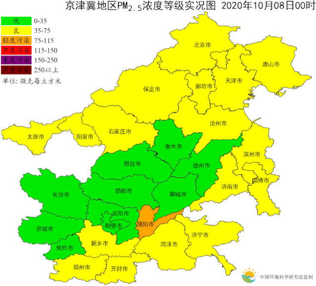 截至10月10日10时,区域内PM2.5日均浓度峰值为122微克/立方米(保定,10月9日),PM2.5小时浓度峰值为176微克/立方米(唐山、保定,10月10日8时);北京市PM2.5日均浓度峰值为110微克/立方米(10月9日),PM2.5小时浓度峰值为156微克/立方米(10月9日9—10时)。