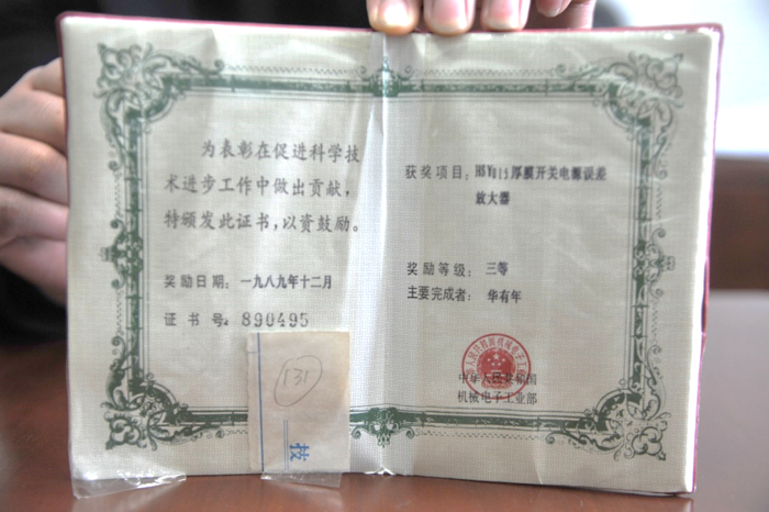 后来我主要做高频。高频技术与彩电的联系源于牡丹电视机厂。当时牡丹电视机厂使用日本技术,开关电源没有任何保护装置。正常电压220V问题不大,电压低了就会烧坏。我们国家电力不足,农村的电压常常到不了220V,电视经常烧坏。日本人认为电视机制造前定的标准是220V,达不到标准不属于他们的负责范畴,流水线弄好了,也不允许大动改换零件。电视用的电路是厚膜电路,我做了很多实验和研究,发现在厚膜电路里增加两个晶体管可以起到保护作用,解决了这个问题,获得一个国家发明三等奖,铜牌。另外我和华龄公司都在高频电路里做了很多工作。