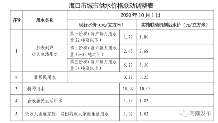 自10月1日起,海口市城市供水价格与海南全省水资源费调整实行价格联动,每立方米调整增加0.03元,水价中包含的水资源费达到0.10元/立方米。