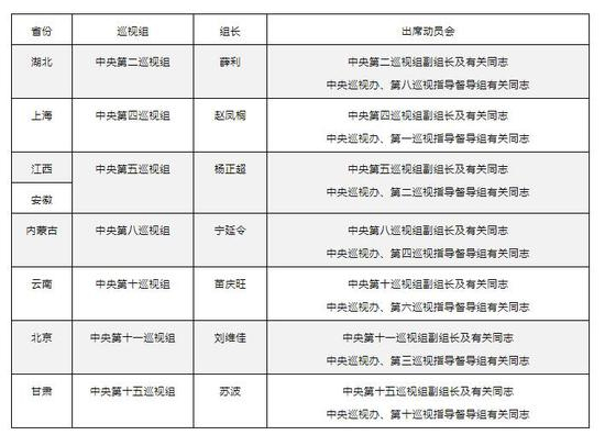 根据官方消息,目前,江西、湖北、上海、安徽、内蒙古、云南、北京和甘肃8省份已经迎来了中央巡视组。