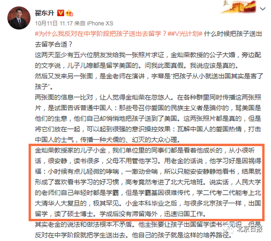同时,10月11日,金灿荣教授的同事翟东升教授在个人微博中帮忙澄清:“金灿荣教授家的儿子小金,我们单位里的同事们都是看着他成长的,从小很听话,很安静,读书很多,父母不用管他学习。(小金)高考考进了北大元培班,本科毕业之后,与很多北京孩子一样,出国留学,读了硕士博士。学成后没有滞留海外,迅速归国工作。”