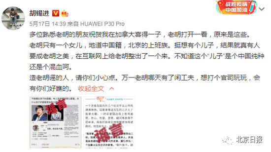 此类谣言此前也多次出现,《环球时报》总编辑胡锡进曾两次在微博中回应此事。他称自己“只有一个女儿,地道中国籍,北京的上班族。”并表示不会被这些诽谤他的力量压垮。