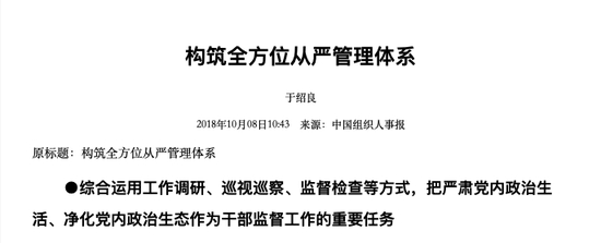 2018年10月,于绍良在《中国组织人事报》刊发了《构筑全方位从严管理体系》的文章。