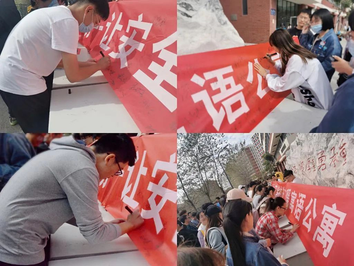 2020级新生张新鹏表示,横幅签名活动是我给学院签署的承诺,一定会谨遵校规校纪,做好文语er,助力学院文暖寓语公寓,让安全住进文暖寓语公寓。