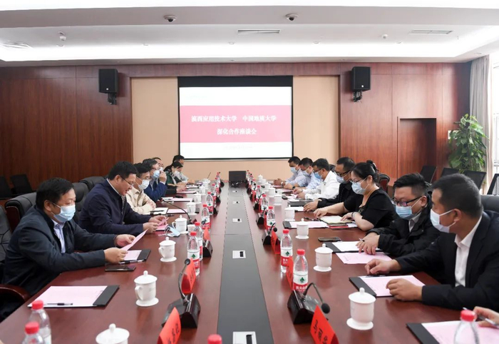 王焰新对袁希平一行的到来表示欢迎。他指出,对口帮扶滇西应用技术大学是教育部党组赋予学校的重大政治任务,也是学校积极响应党中央、国务院决战决胜脱贫攻坚的责任担当。他表示,学校将一如既往地加强校校合作,充分发挥学校在地球科学、资源环境等领域的学科优势,持续支持滇西应用技术大学在学科建设、产学研建设、师资队伍建设、实习基地建设、高质量人才培养等方面的发展,并不断拓展合作领域,助力该校提升水平、办出特色。王焰新要求学校各参会单位人员把责任放在心上、把使命扛在肩上,加强与滇西应用技术大学的交流合作,为当地扶贫扶智、脱贫攻坚贡献地大力量。