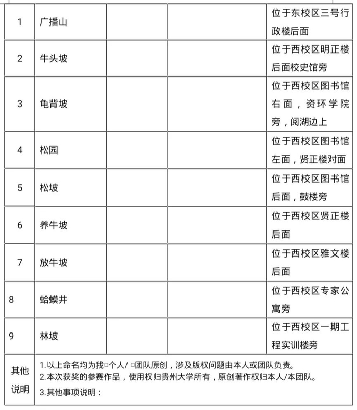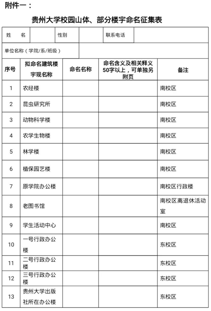 附件一:贵州大学校园山体、部分楼宇命名征集表
