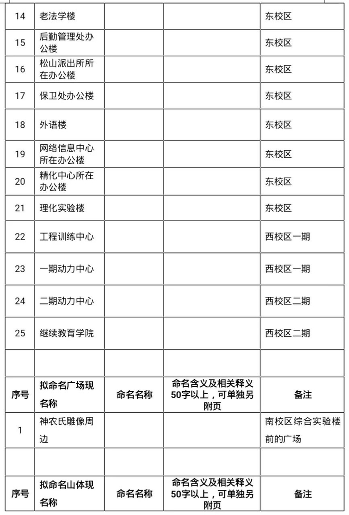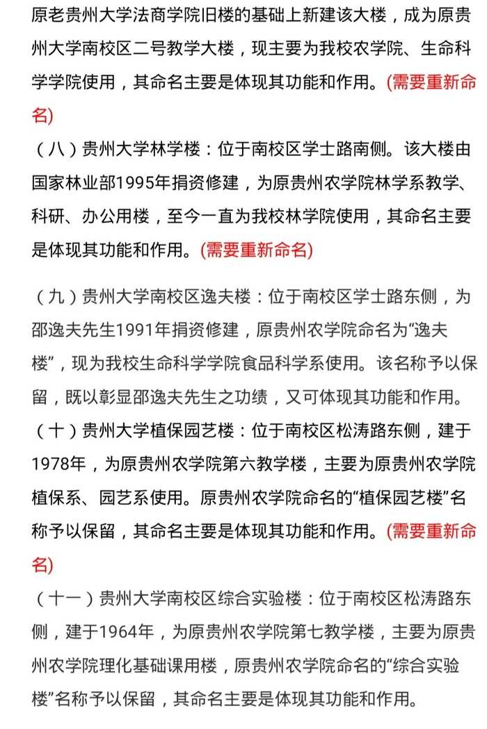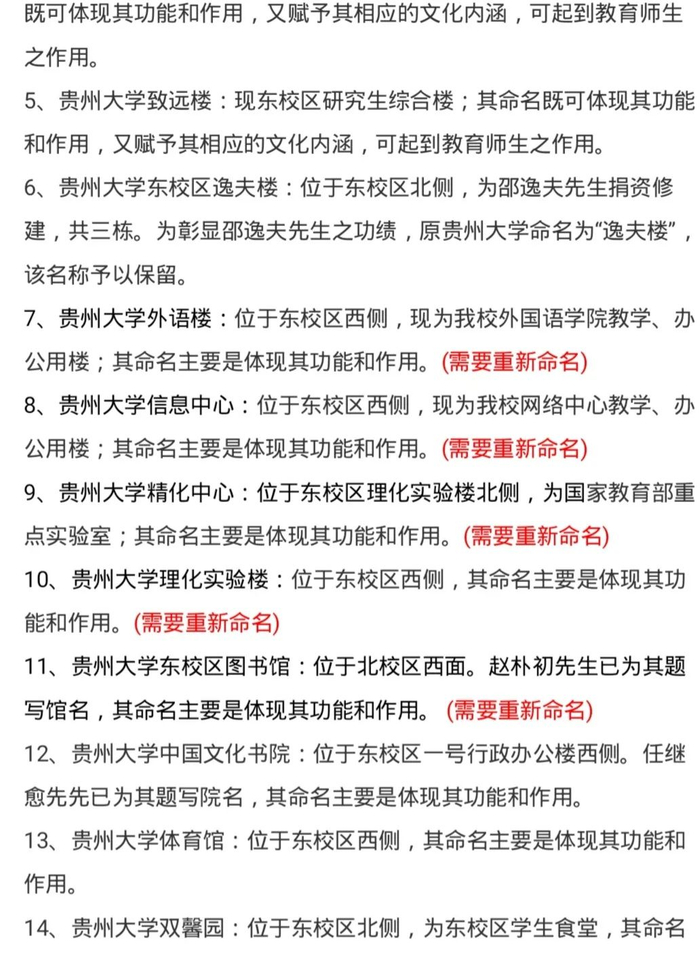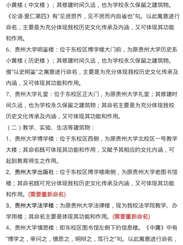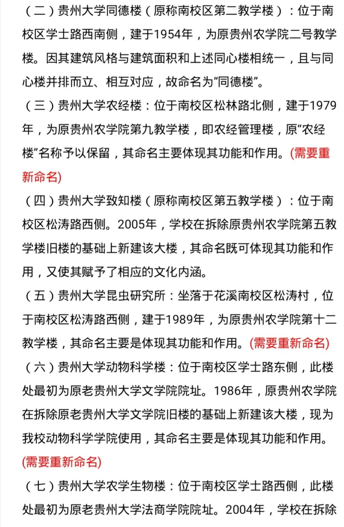 具体需要重新命名的楼宇及山体详见附件一,《贵州大学校园山体、部分楼宇命名征集表》。