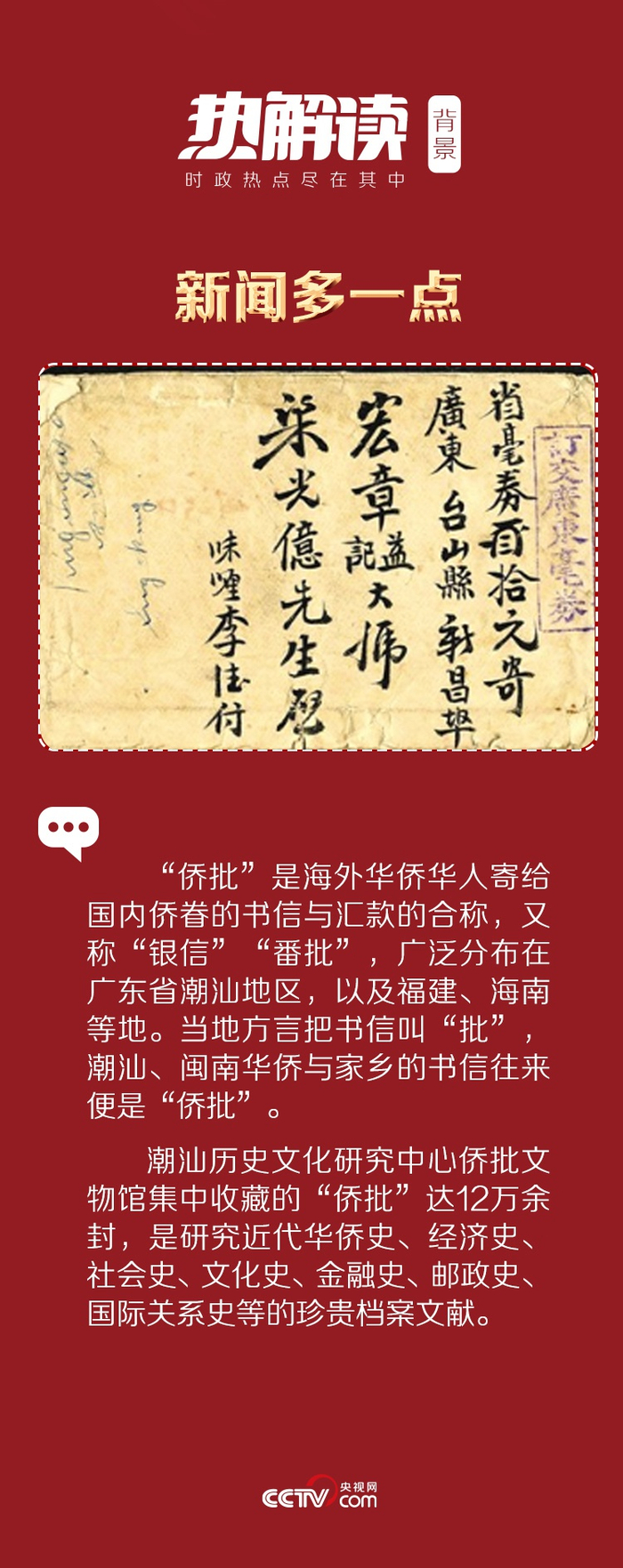 在潮汕方言中,“批”即是“信”的意思,是海外侨胞通过民间渠道寄给家乡眷属的书信和汇款凭证的合称。纸纸侨批,寄托着潮汕侨胞浓浓的乡愁。其中,有对家人的牵挂,有对家乡的眷恋,更有对祖国繁荣昌盛的祝愿和希望。