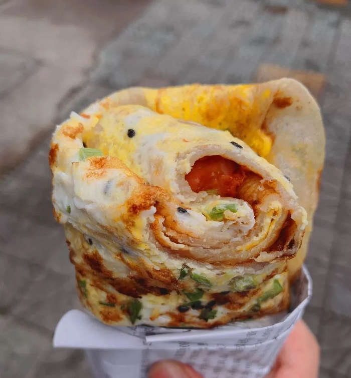而另一道民间美味——鸡蛋饼,葱香、火腿和榨菜酱三者缺一不可,制作虽简单但好吃饱腹,品尝过的人谁能不竖起大拇指!