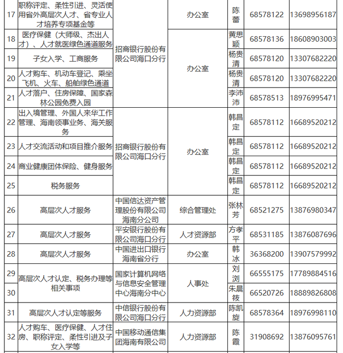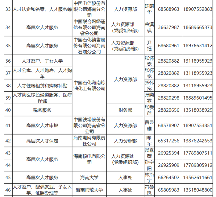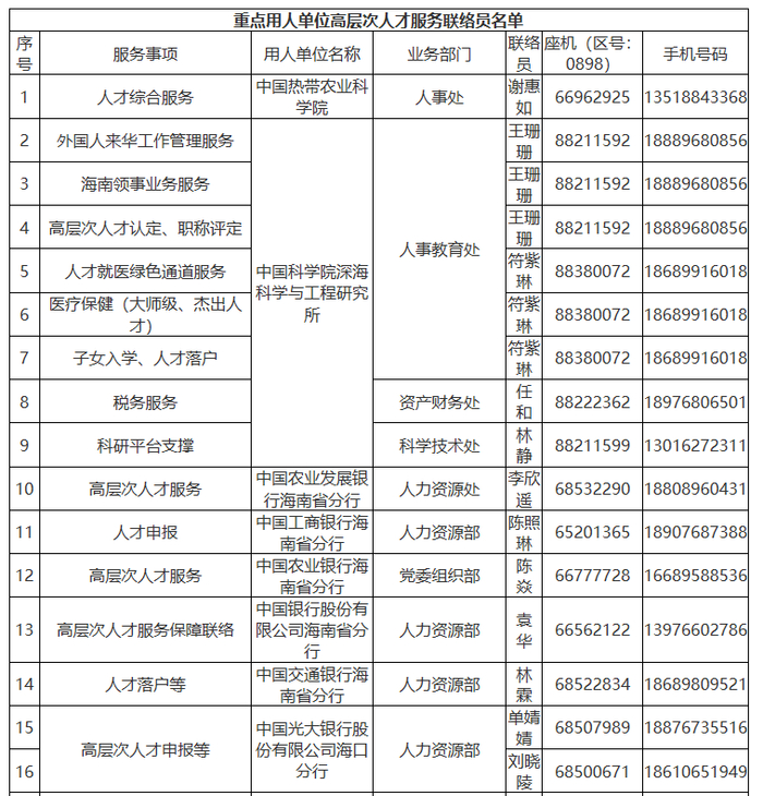联系方式全公开!海南公布90名重点用人单位高层次人才服务联络员名单