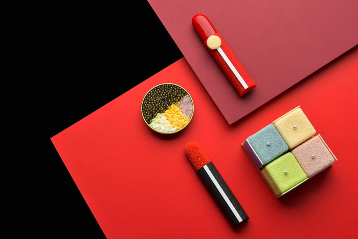 厨师以纪梵希红丝绒唇膏及夏桐·禧起泡红葡萄酒为灵感,将人气唇膏变为甜品,入口后可感受到清新树莓、馥郁玫瑰、古典伯爵茶和经典可可的多重风味。而纪梵希美妆的另一款明星单品四宫格散粉,被打造成四色蛋糕,包括茉莉花茶蜜桃、酒味芝士、焦糖青苹果和玫瑰提拉米苏四种口味。芬芳细腻的起泡酒融入其中,带来悠长的葡萄香气。另外,鲟鱼鱼子酱、天鹅栗蓉酥、玫瑰紫薯南瓜糕等,也都适合搭配起泡酒。