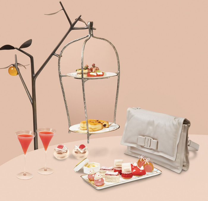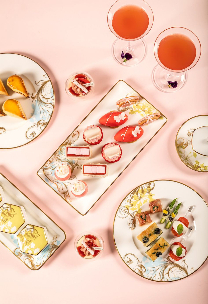 北京王府井文华东方酒店携手意大利奢侈品品牌菲拉格慕,推出“Viva Viva”联名主题下午茶,设计灵感源自菲拉格慕2020年春夏Viva手袋。甜点中的提拉米苏、奶冻,咸点中的佛卡恰面包等,以粉色为主色调,柔和轻快,充满灵动活泼的少女感。