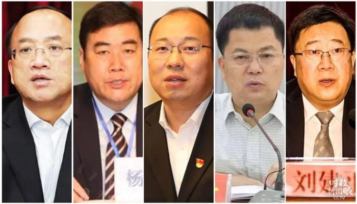 从左至右依次是云南怒江州委书记纳云德、新疆和田地委书记杨发森、河南兰考县委书记蔡松涛、广西大化县委书记杨龙文、贵州赫章县委书记刘建平。