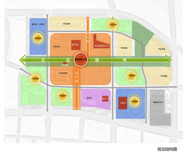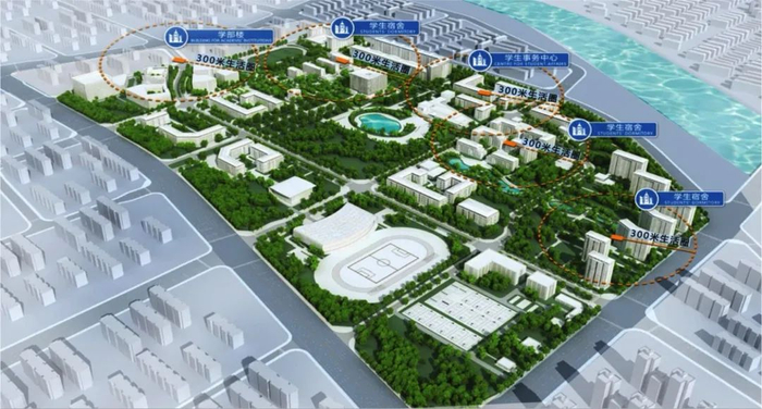 学生宿舍、食堂与图书馆、公共教学楼、学生事务中心、五大学部等公共建筑交错布置,学生在300米步行距离内就可基本解决对校园功能的需求。