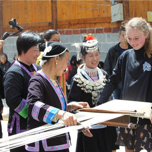 广南村侗族群众在教耶鲁大学研学团队学员纺侗布体验侗家织布