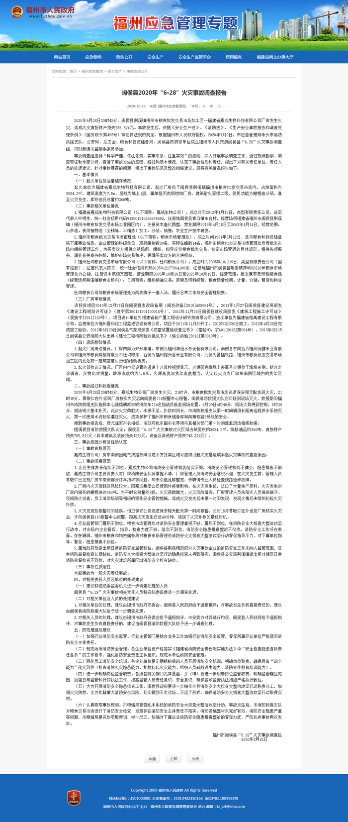 福州市人民政府网站10月16日发布《闽侯县2020年“6·28”火灾事故调查报告》,全文如下: