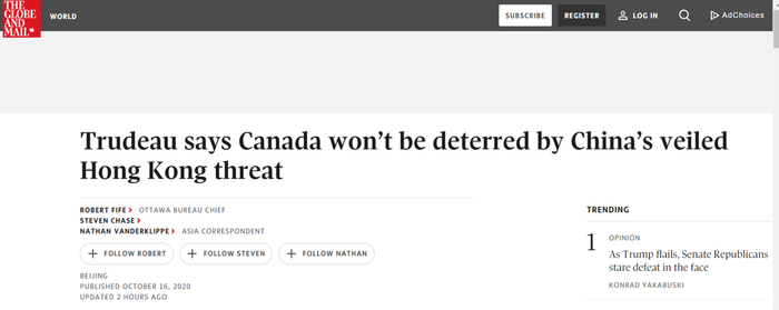 [环球网报道]加拿大还在抹黑中方搞“胁迫外交”。据加拿大《环球邮报》报道,加拿大总理特鲁多16日受访时声称,自己不想与中国陷入不断升级的口水战,但加拿大不会因中国的“胁迫外交”而保持沉默,他还誓言,继续就所谓的“涉港民权”、释放加公民等问题向中国施压。