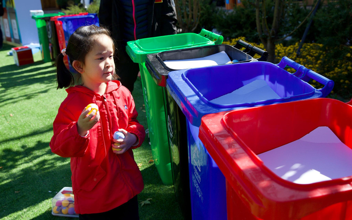 一位小孩正在参与趣味垃圾分类活动。摄影/新京报记者 李凯祥