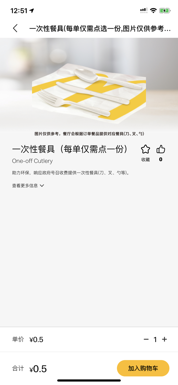 10月17日,新京报打开麦当劳APP和美团、饿了么等订餐平台发现,在麦当劳深圳门店点餐的菜单中,增加了一项一次性餐具的选项。一次性餐具的售价为0.5元,同时标注显示每单仅需点一份,餐厅会根据订单餐品提供对应餐具(刀叉勺)。同时,消费者也可以选择不需要餐具。