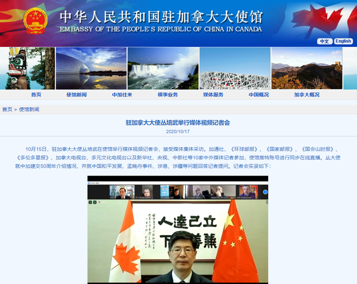海外网10月17日电 据中国驻加拿大大使馆官网17日消息,10月15日,驻加拿大大使丛培武在使馆举行媒体视频记者会,接受媒体集体采访。加通社、《环球邮报》、《国家邮报》、《国会山时报》、《多伦多星报》、加拿大电视台、多元文化电视台以及新华社、央视、中新社等10家中外媒体记者参加,使馆推特账号进行同步在线直播。丛大使就中加建交50周年介绍情况,并就中国和平发展、孟晚舟事件、涉港、涉疆等问题回答记者提问。记者会实录如下: