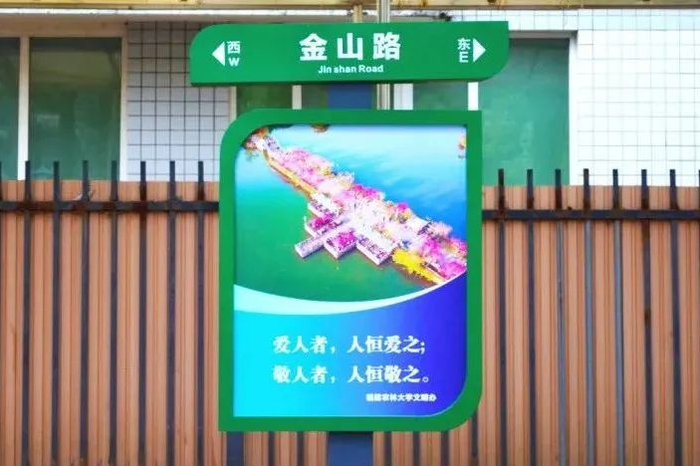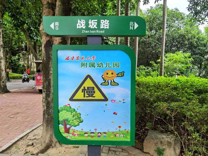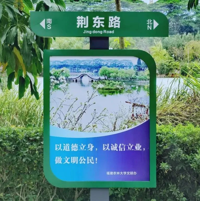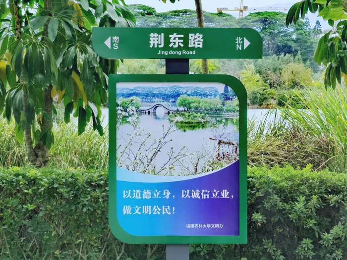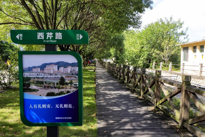 福建农林大学金山校区校园内的道路大部分自学校创办以来,以办学所在地的名称来命名。有洋枋路、魁岐路、金山路、梅峰路、屏山路、战坂路、荆东路、西芹路等等,其中,金山路最长达到1.5公里,神蜂路最短只有100多米。这些路不仅连接着师生在校园中的学习和生活线路,沿途的桥亭栈道、莲池鸟岛、桃花红翠都是我们走过的路,同时,也见证了农林大所走过的荏苒风华。