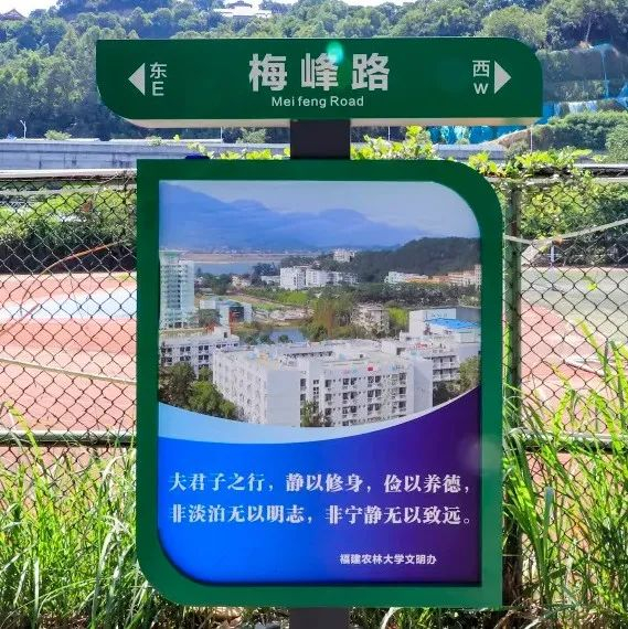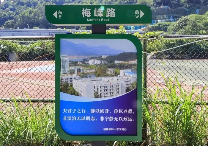 1956年,因即将动工兴建的福州马尾铁路需穿过校园,学校寻址搬迁,选定在福州近郊毗邻西湖公园的梅峰乡重新建校。现如今以梅峰校区命名的梅峰路位于诚智楼与下安田径场之间,位于下安食堂的南侧。诚智楼作为福建农林大学金山校区的主教学楼之一,是许多农大学子每天上课“打卡”的地方。梅峰路两旁还栽种了荔枝树,在六、七月就可以看到一串串红彤彤的荔枝挂满在枝头,令人流连忘返。