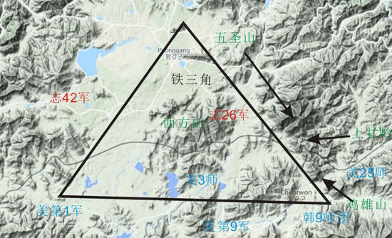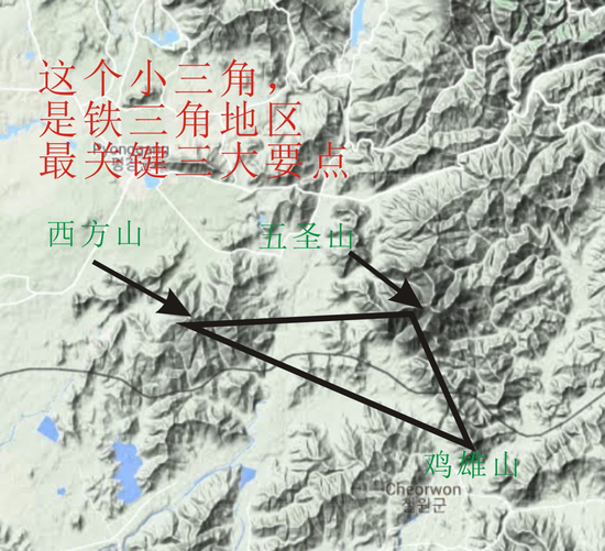 “铁三角”一带的要点有四:分别是东边的白马山,中部的西方山,和东边的鸡雄山、五圣山。而鸡雄山和五圣山之间,就是著名的上甘岭。