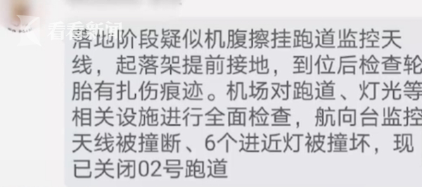 10月16日,航空专业社群流传一则消息称,深航一航班在攀枝花机场降落时发生不安全事件,落地阶段疑似机腹擦挂跑道监控天线,起落架提前接地,到位后检查轮胎有扎伤痕迹。该消息还称,航班落地后,攀枝花机场对跑道、灯光等相关设施进行全面检查,航向台监控天线被撞断、6个进近灯被撞坏。