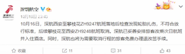 对此,深圳航空16日夜里作出回应称,当天深航西安至攀枝花的一架飞机,在落地后的检查中被发现轮胎扎伤,不符合放行标准,后续攀枝花至西安航班取消。航空公司已妥善安排旅客改乘次日航班并入住酒店。同时,为需要取消行程的旅客免费办理退改签手续。据澎湃新闻报道,该事件并未造成人员伤亡。