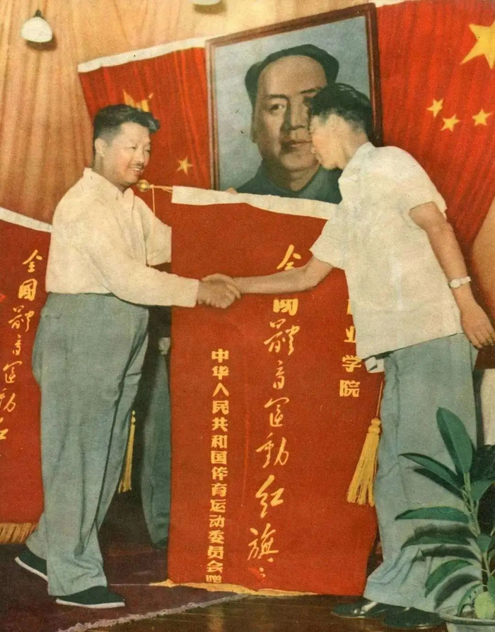 1958年9月,北京矿业学院获“全国体育运动红旗院”称号,国务院副总理贺龙元帅代表国家体委向我校亲授锦旗。