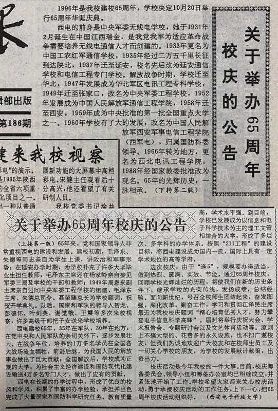 1996年10月20日,西电迎来65周年华诞,校园里红旗招展,彩球当空,全校师生及四海嘉宾齐聚一堂,隆重举行庆典大会。