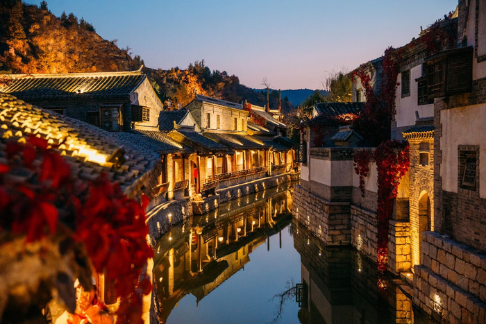 在小镇的青石板老街散步,或乘船摇橹,或拾级而上,随处都是与建筑相得益彰的红叶景致。游客可以登上古北水镇背靠的司马台长城,登高望远,霜染层林,同时还能俯瞰小镇和远处的群山秋色。如果愿意起个大早,长城日出也值得一看。