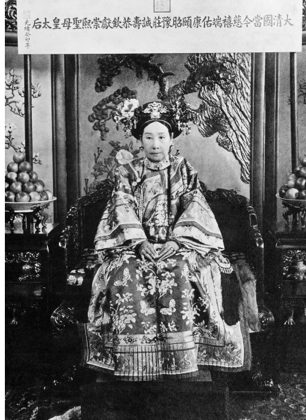 慈禧太后照片,上方横联上写着她的一长串徽号