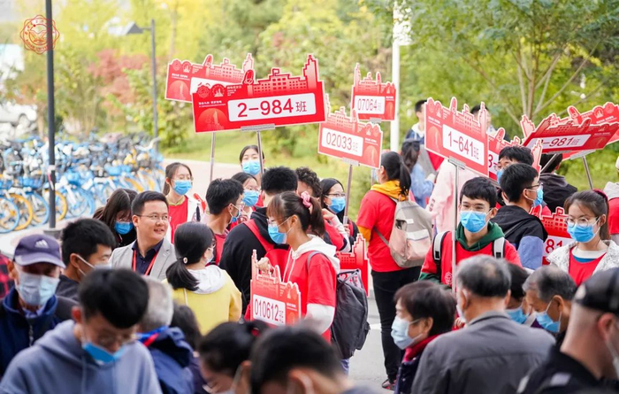 离大会开始还有一个多小时,远望谷体育馆下的签到现场已经人头攒动,返校的校友们正忙着排队在背景板前合影留念,领取纪念品,一位白发苍苍的老校友引起了人们注意。