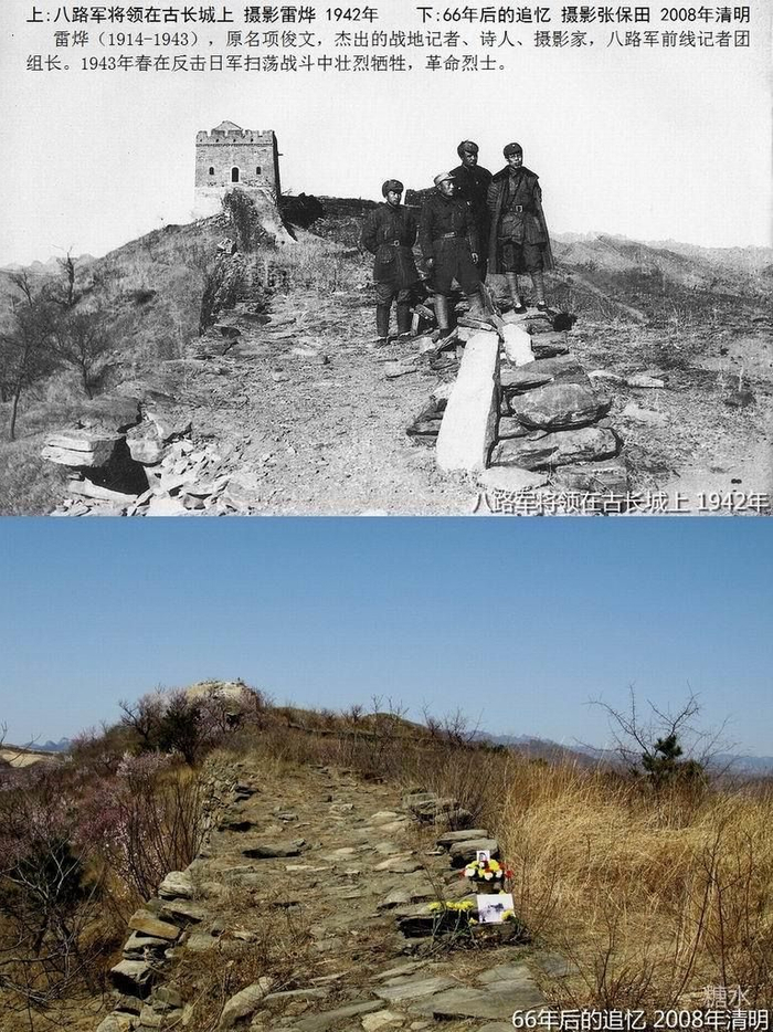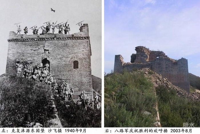 1942年的《八路军将领在古长城上》老照片与2008年在同一地点拍摄的照片。受访者供图