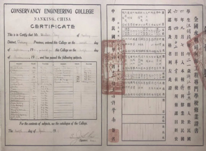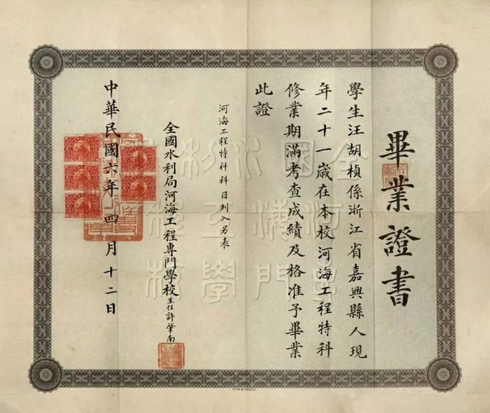 河海工程专门学校首届毕业生汪胡桢先生的毕业证书